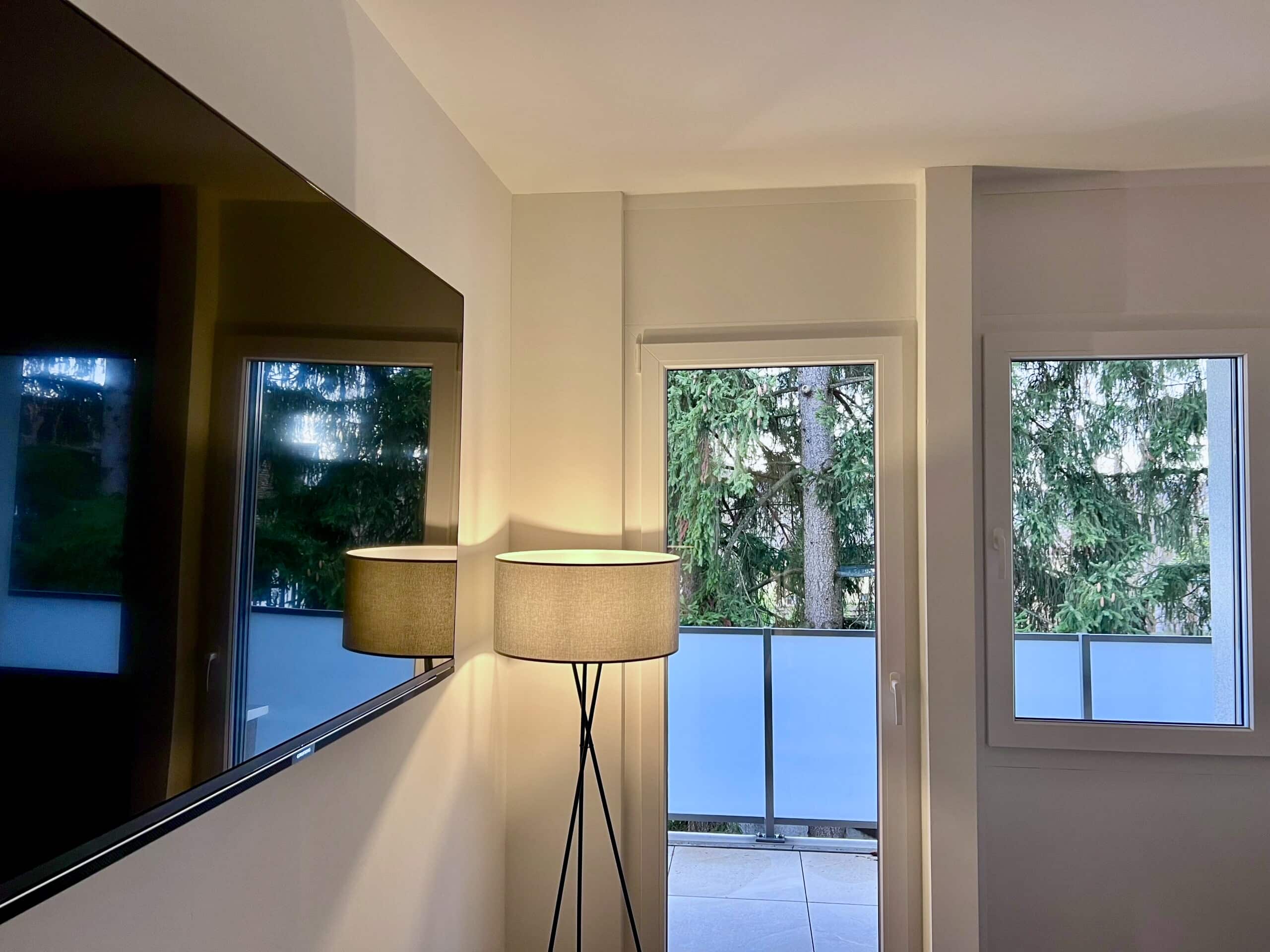 A spacious balcony and queen-size box-spring bed: the Superior Studios Wallisellen on the 1st floor offer everything you need to feel at home.